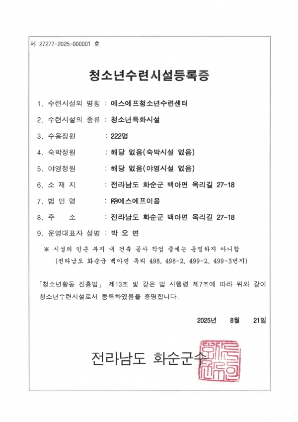 청소년수련시설등록증